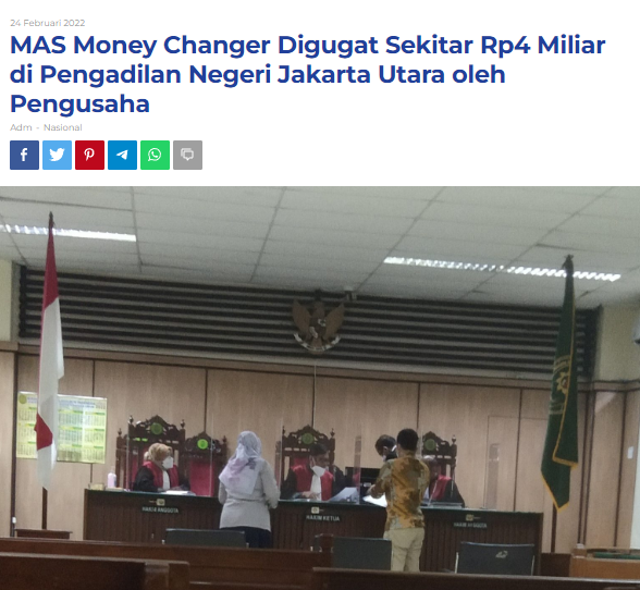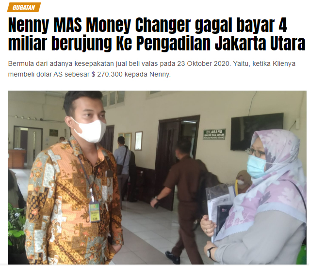 Jakarta | Gegara tidak membayar transaksi pembelian valuta asing (valas) mata uang dollar USA sebesar Rp3,98 miliar pengusaha valas Nenny MAS Money Changer digugat oleh oleh pengusaha HA ke Pengadilan Negeri (PN) Jakarta Utara. Hal ini disebutkan oleh Advokat Oktavia Sastray dari Kantor Hukum P. Hadisaputro.