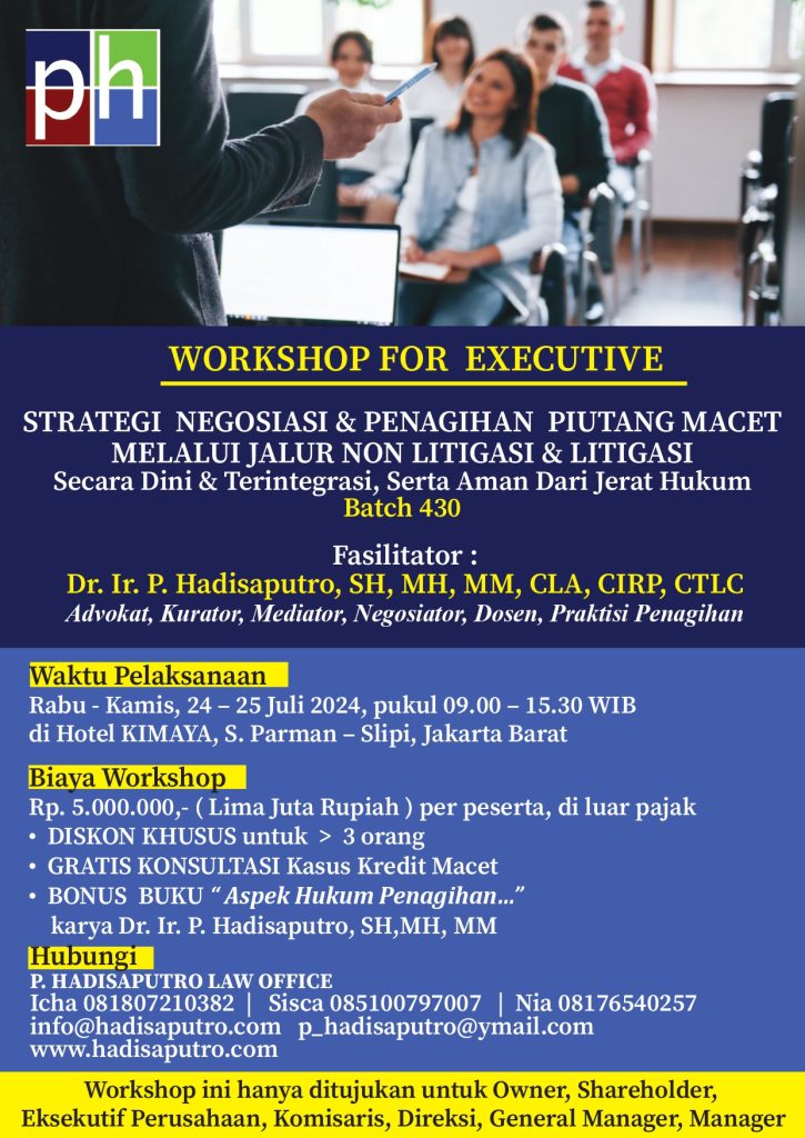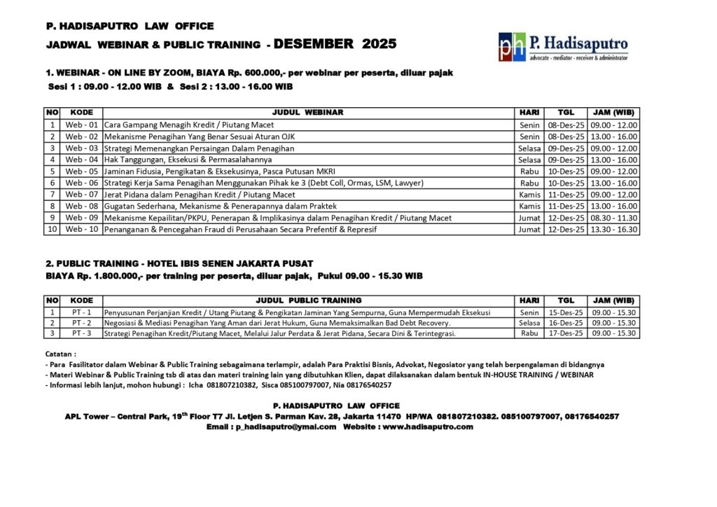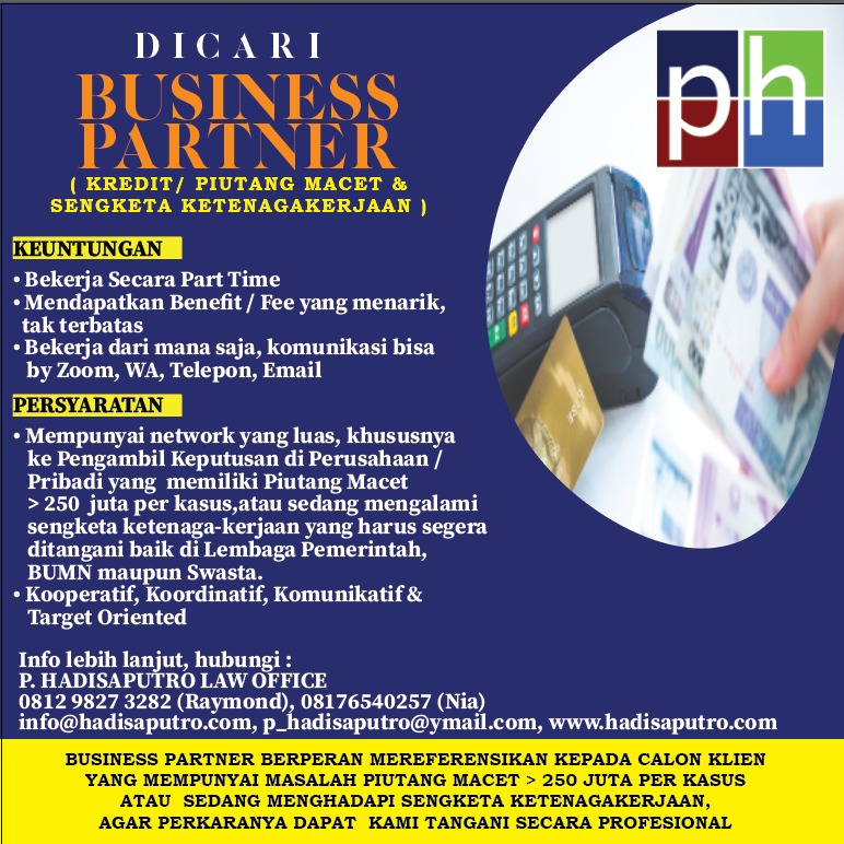 P. Hadisaputro Law Office mempunyai layanan hukum bidang Litigasi maupun Non Litigasi, termasuk dalam hal Penagihan & Penanganan Kredit / Piutang Macet serta Pelatihan bidang Hukum. Kami telah berpengalaman > 20 tahun dalam menangani berbagai kasus / sengketa hukum & pelatihan hukum, baik di Perusahaan maupun Perorangan. Kualitas layanan kami terjaga & dapat dipertanggung-jawabkan, mengingat SDM kami sangat kompeten di bidangnya serta memiliki network yang luas di instansi terkait seperti OJK, Pengadilan, Kepolisian, Kejaksaan dan Mahkamah Agung.